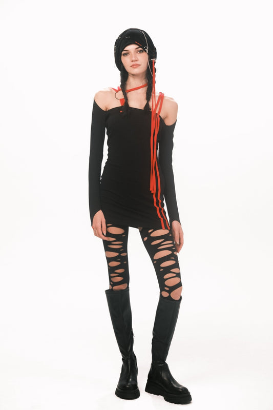BLACK C-BARBELL STRAPPY MINI DRESS