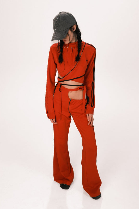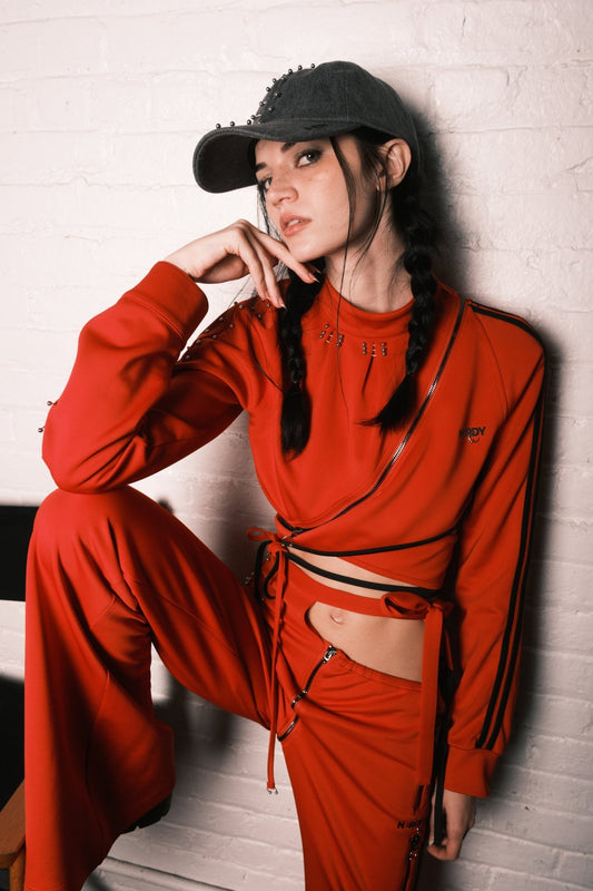 RED WRAP TIE ASYMMETRICAL TRACK JACKET