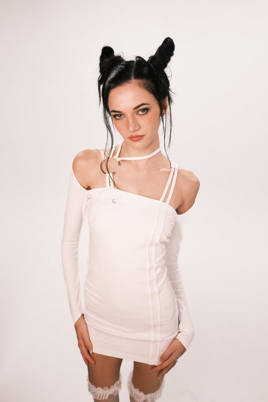 WHITE C-BARBELL STRAPPY MINI DRESS