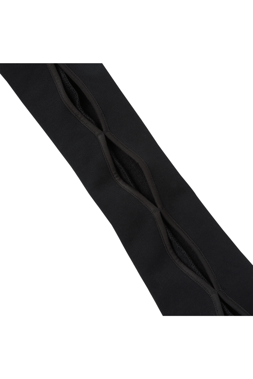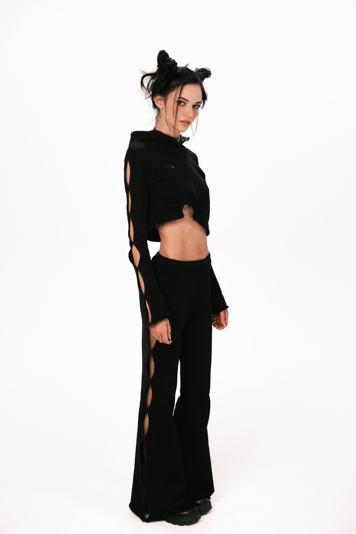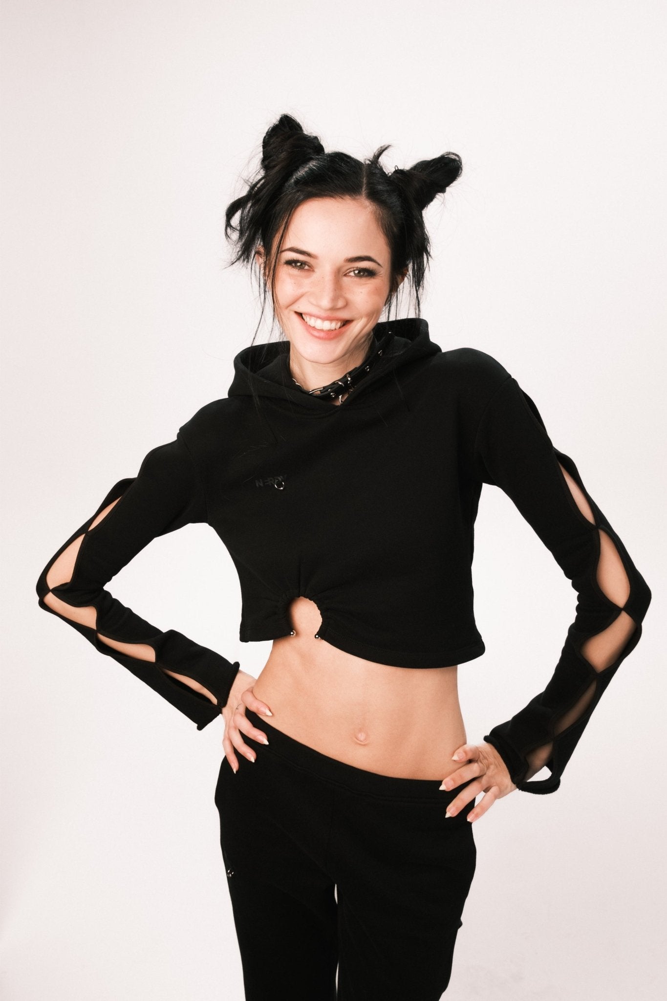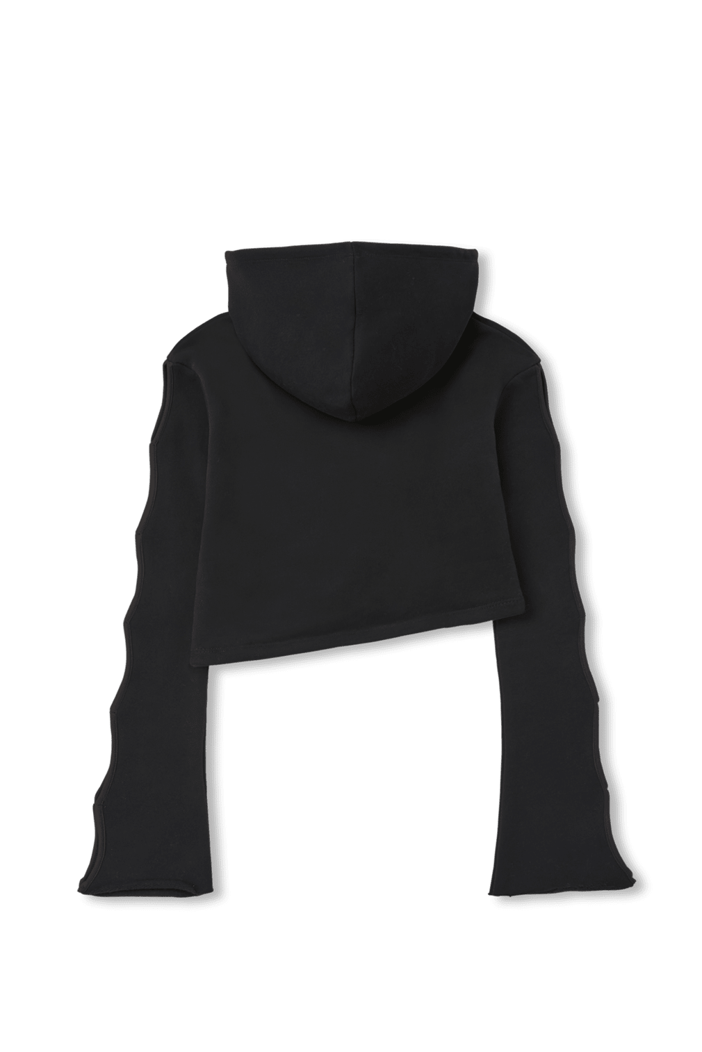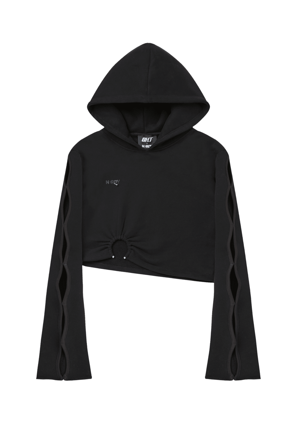 Long sleeve cropped cotton hoodie in black featuring cut out details along both sides of the sleeves. Asymmetrical bottom hem, gathered with extra large horseshoe piercing.