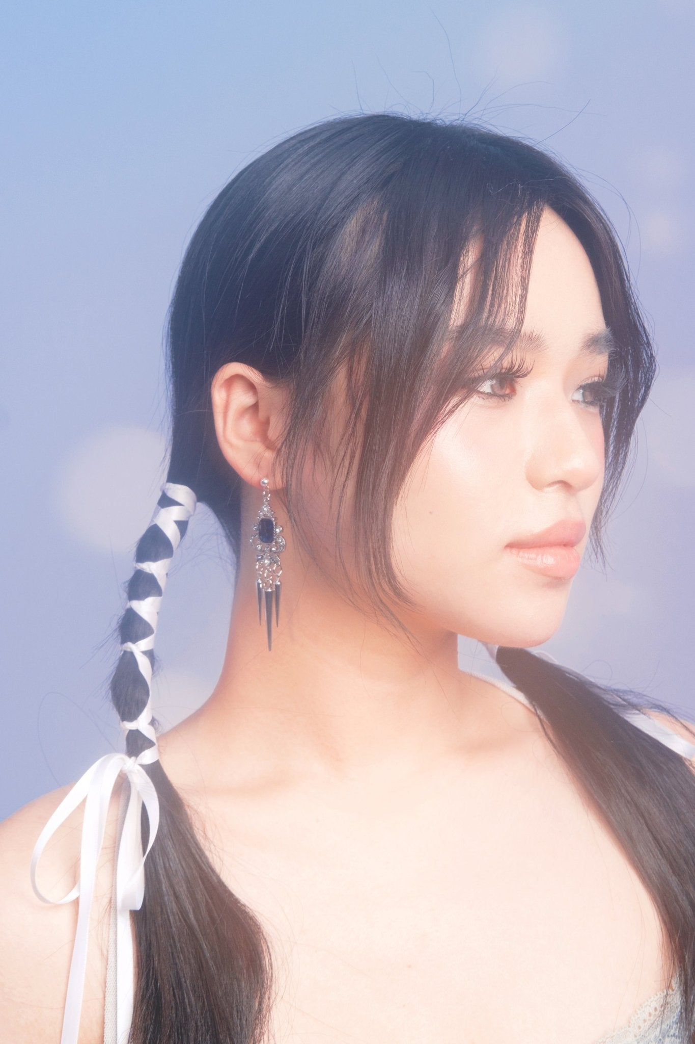 Pair of stud earrings in silver-coated metal. Sapphire chandelier charm with spikes. Post stud fastening.